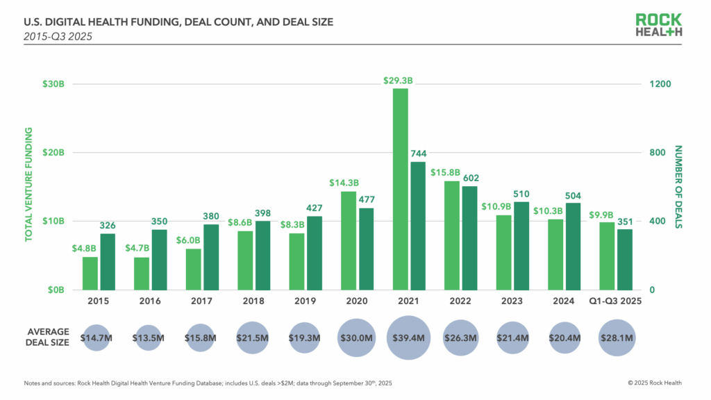 – The U.S. digital health sector saw $3.5B in venture funding across 107 deals in Q3 2025, contributing to a year-to-date total of $9.9B, according to Rock Health’s Q3 2025 report. While this pace surpasses 2024’s total through Q3, the apparent steadiness belies significant underlying market shifts.