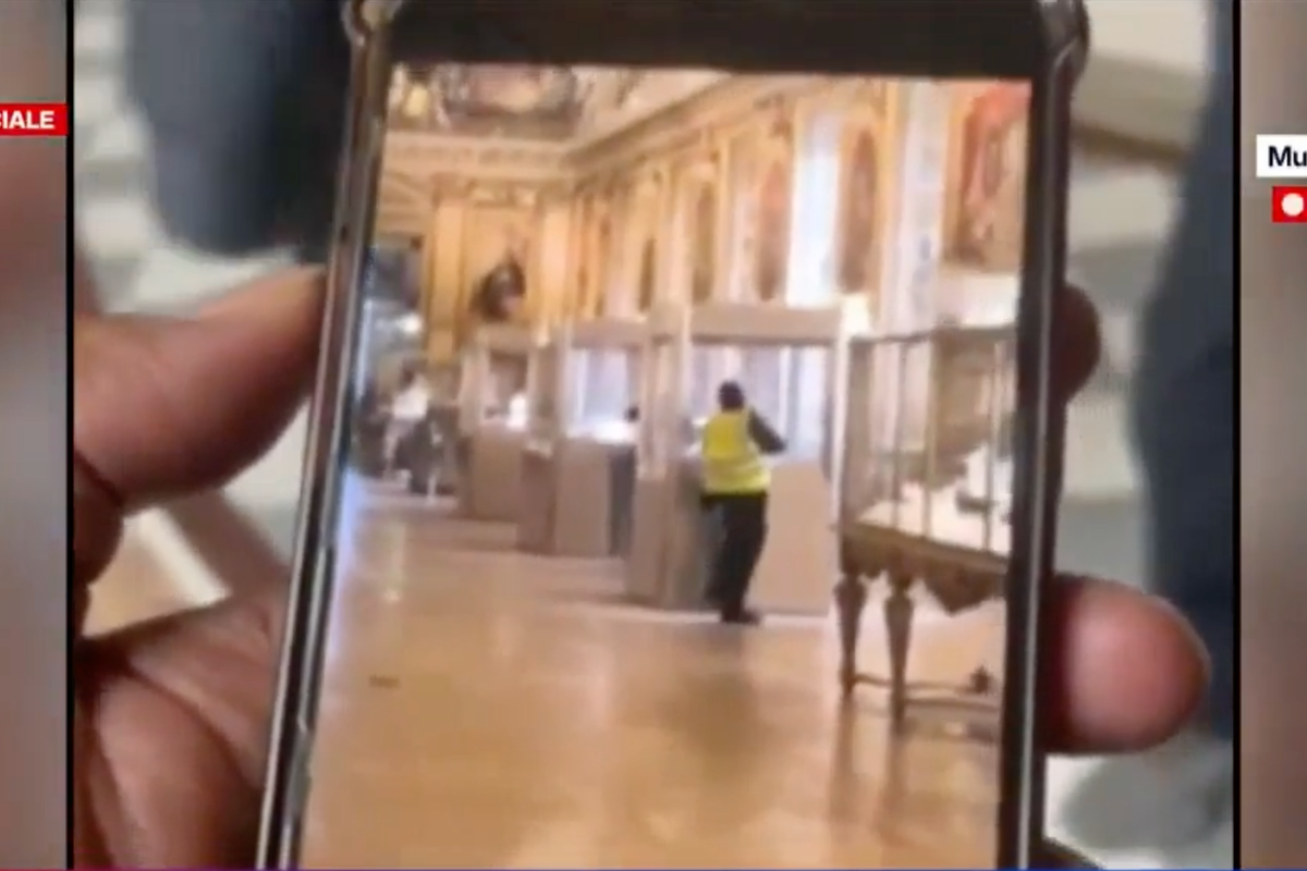 Watch as one of the suspected the Louvre jewellery thieves is seen on camera wearing a hi-vis vest as he appears to break into a glass cabinet.