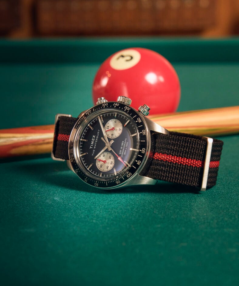 Timex is tapping into two different centuries worth of watch design with the debut of two new chronographs. The first, the Waterbury Heritage Chronograph, travels all the way back to the American watchmaker’s 19th-century origins as the Connecticut-based Waterbury Clock Company. A 39-mm brushed case made from recycled stainless steel, is complemented by a black tachymeter bezel for calculating average speed and a chronograph function for tracking elapsed time.