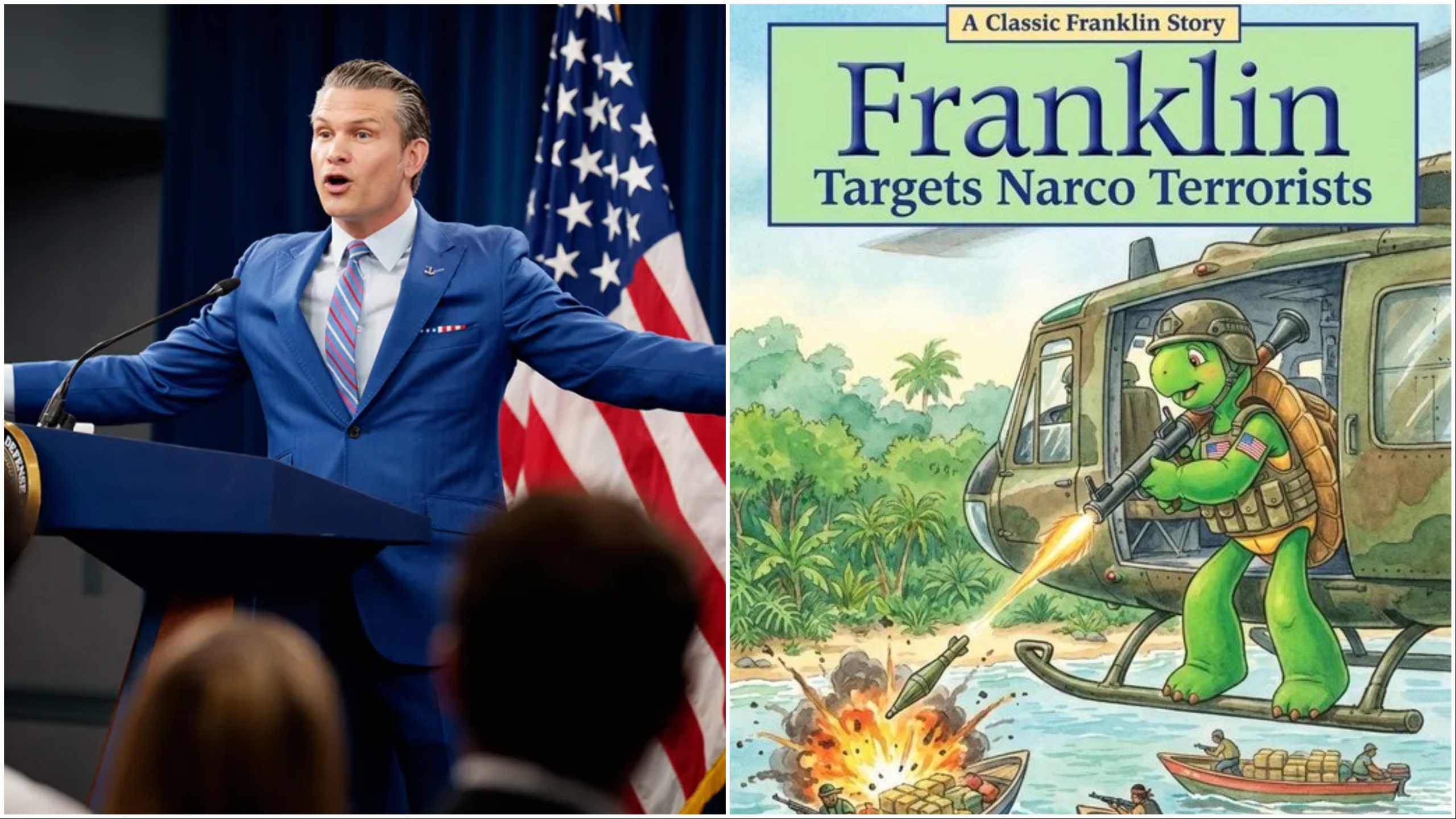 In a post on X over the weekend, Hegseth shared an image of a doctored book cover, titled “Franklin Targets Narco Terrorists,” that depicted the primary-school-aged turtle firing a rocket-propelled grenade at apparent drug traffickers. “For your Christmas wish list …” Hegseth wrote.