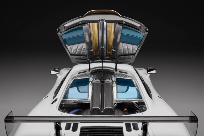 The world’s first road car to achieve downforce-producing ground effect was famously developed by Gordon Murray, the Formula 1 designer whose racers racked up 50 Grands Prix wins. While tame compared to the radical electrified hypercars of today, the F1 was unprecedented in the ’90s, with an all carbon-fiber/Kevlar monocoque chassis, three seats, zero electronic diver aids, aerodynamic cues from the 1971 Ferrari 312P sports racer, an entirely flat floor that enabled ground effect, and a BMW-sourced naturally aspirated 6.1-liter V12 producing 627 horsepower and 479 pound-feet of torque.