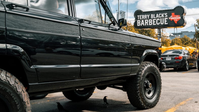 On both vestments and vehicles, no color is more sophisticated than black, especially when compared to the brown, green, and other earth tones that are burned into the memories of those who remember the original Wagoneer. The exterior received a comprehensive murdered-out makeover, including the typically chrome elements. Even the signature woodgrain siding was also reworked in layered gray and black tones using the Japanese Yakisugi (Shou Sugi Ban) technique, which is meant to add visual depth to charred wood.