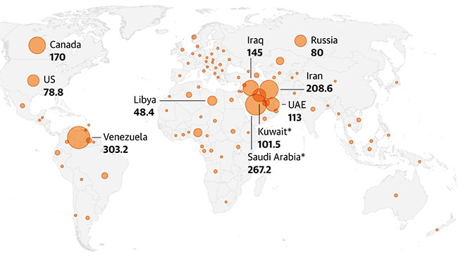 A graphic showing oil reserves of producing natiions on a map