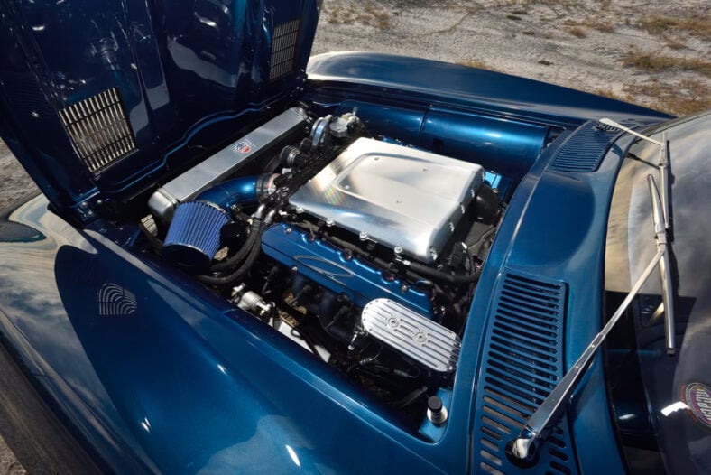 The original Corvette’s stylish but purely ornamental scoops, vents and even the hood-mounted “cookie tin” grates now deliver improved ventilation for the passenger compartment and heat dissipation for the engine—a 6.2-liter LT4 V8 equipped with forged internals, Mast Motorsports Black Label heads, a BTR camshaft, and an LT supercharger topped with Peter Brock’s own intake cover. The souped-up power unit sends 725 horses through a Tremec TKX five-speed manual transmission.