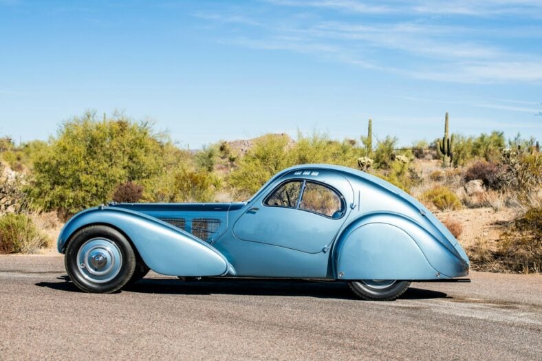 (The low hood and iconic curves of the Type 57 Atlantic / Bugatti)