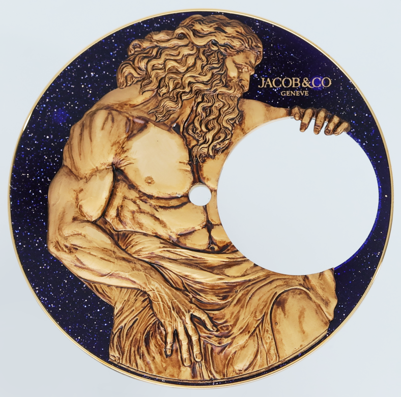 The movement itself, weighing in at a mere .27 grams, was developed from “a blank page,” Jacob and Co. notes, using a sapphire upper bridge and placing the movement underneath a blue aventurine slab. The figure of Chronos is hand-crafted and burnished over the course of several days, as if the movement itself wasn’t impressive enough: The horologist notes the figure of Chronos and its production “is one of the most impressive Métiers d’Art artifacts ever featured in a high complication timepiece.”