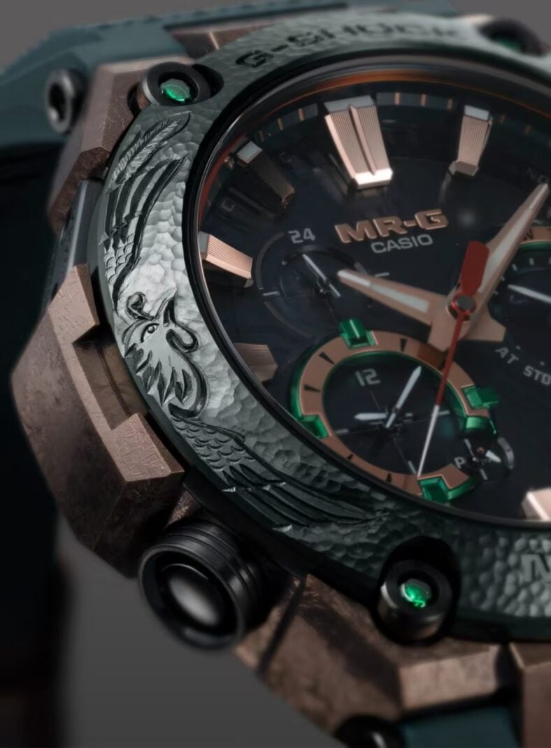 The remarkably intricate process was led by accomplished metalsmith Kobayashi Masao, with a delicate gradient finish worthy of a closer look. “The gradated color of the dial ring captures the dynamic beauty of the phoenix’s graceful flutter,” G-SHOCK said, while emerald-inset bezel screws nod to the power of truth and wisdom, the company notes. “These dazzling elements come together to create one of the most luxurious designs in the MR-G lineup,” the watchmaker added.
