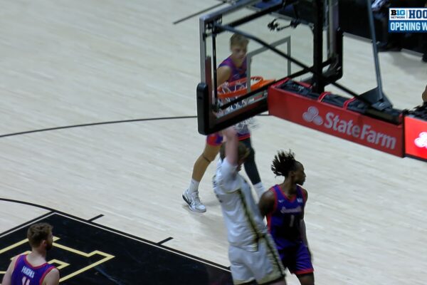 Braden Smith found Daniel Jacobsen for a tough alley-oop dunk, extending the Purdue Boilermakers lead over the Evansville Purple Aces. Read More